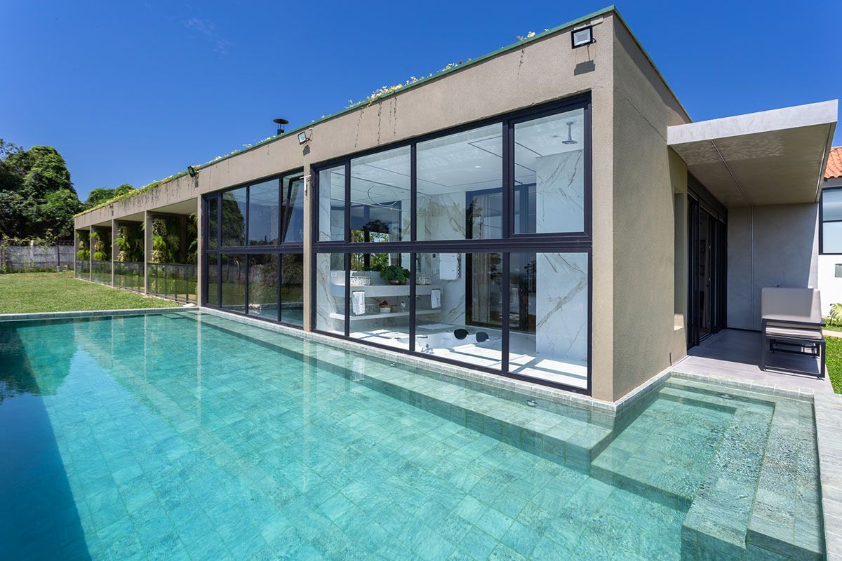 Cercado por verde, o espaço se transforma com facilidade para atender quaisquer desejos, tendo em vista seu amplo espaço e características neutras de construção.