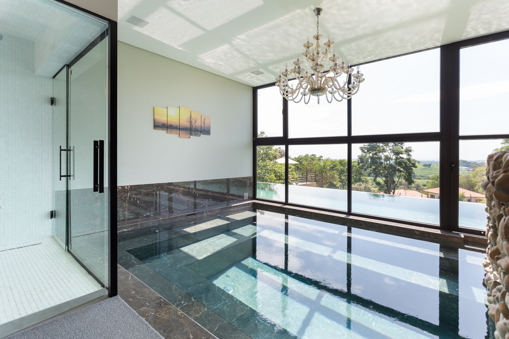 Suíte com piscina privativa e vista para a natureza e área de esporte.