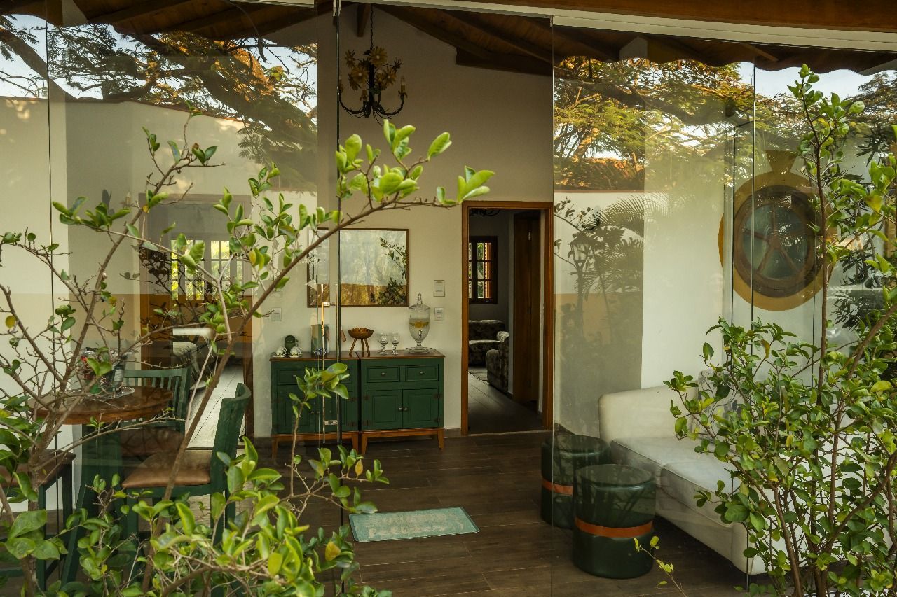 A fachada original do casarão foi mantida, enquanto os interiores foram modernizados. São cinco suítes aconchegantes, salão de jogos, áreas de convivência e o memorial da fazenda. Ao lado, o “Cantinho Tico-Tico” homenageia a matriarca da família em um jardim delicado e intimista.
